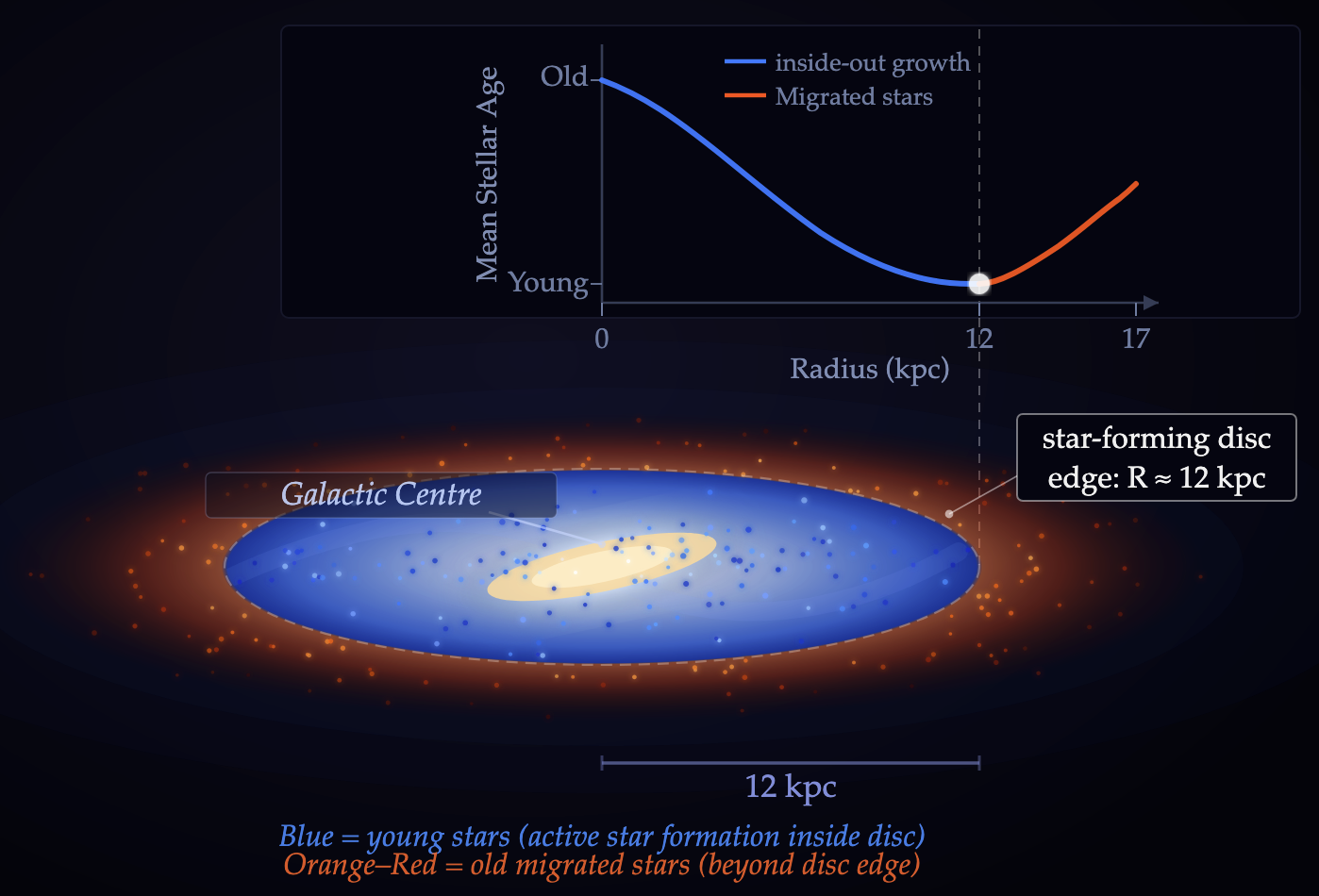 Дисковые галактики формируют свои звезды от центра к краям, но этот процесс не бесконечен. Гипотетически должна быть грань, за которой нет звездообразования. Сопоставив возрасты звезд, ученые впервые смогли вычислить эту границу Млечного Пути с достаточной точностью.