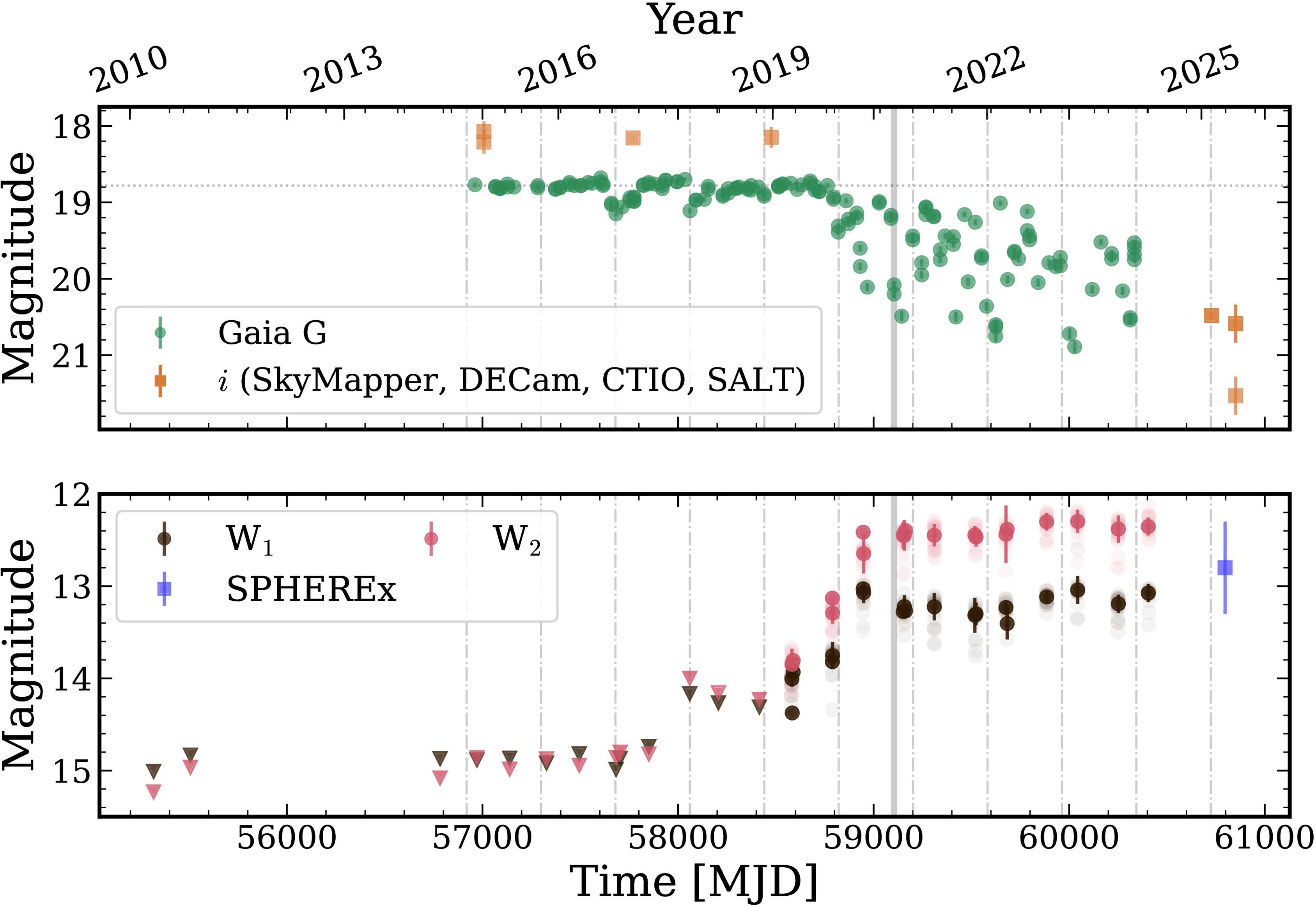 Согласно кривым блеска в период с 2014 по 2017 год звезда вела себя не примечательно, однако затем вначале продемонстрировала в оптическом диапазоне три падения яркости с переменной глубиной и средней продолжительностью около двухсот дней, а после на четыре года быстро уменьшила свою яркость, которая остается низкой до сих пор. При этом в инфракрасном диапазоне звезда стала ярче, демонстрируя с 2019 года плато по яркости.