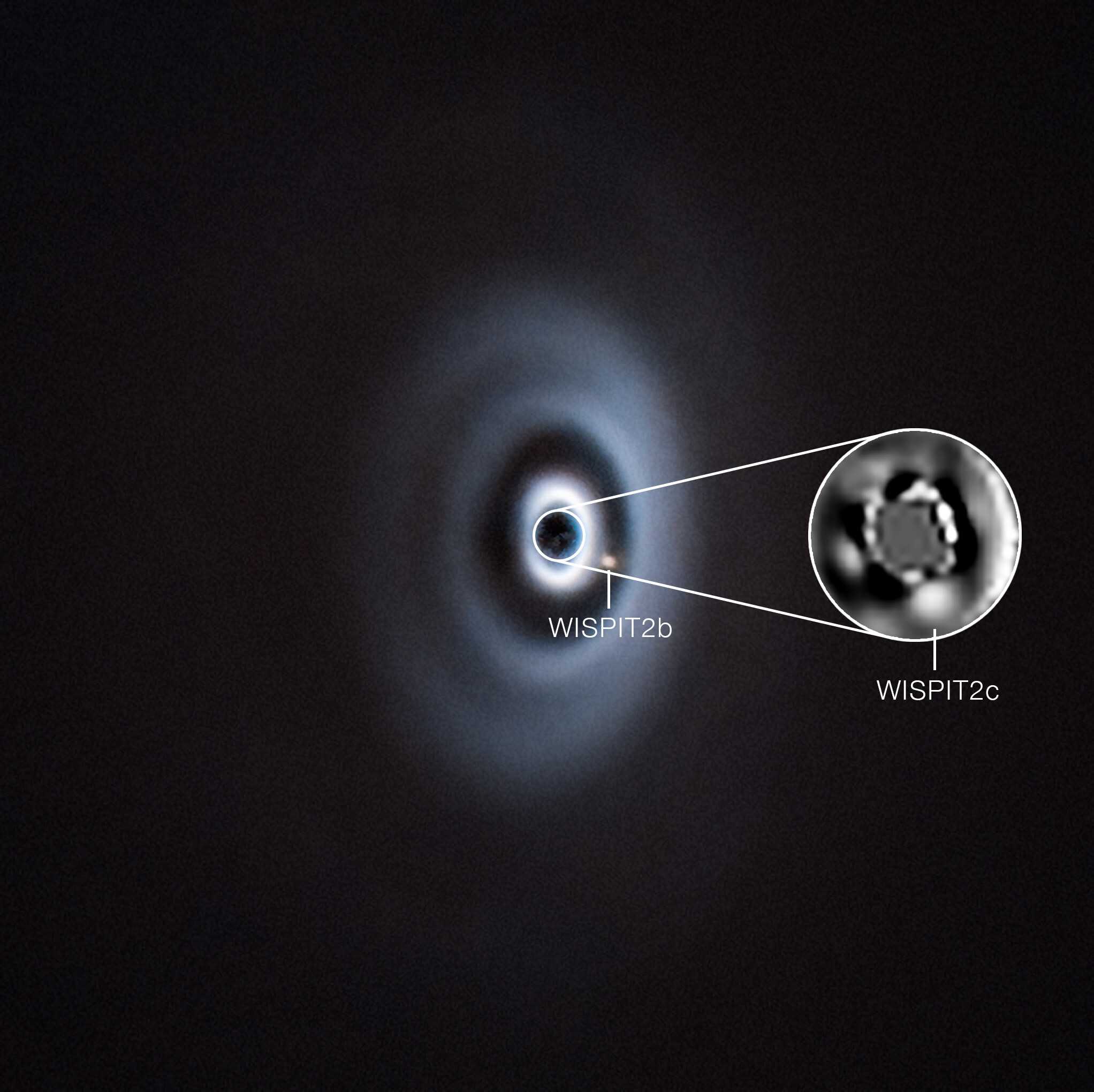 На первых снимках сразу стало видно, что большой протопланетный диск WISPIT 2 разбит как минимум на четыре кольца. Это стало главным отличием WISPIT 2 от других молодых систем, где удалось разглядеть в диске формирующуюся планету. Вообще, разрывы в дисках могут возникать в результате внутренних гравитационных взаимодействий, но ученые все же надеялись найти там хотя бы еще одну планету — и оказались правы.