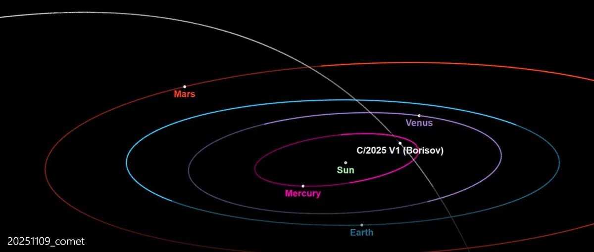 Недавно открытая комета C/2025 V1 была впервые замечена 2 ноября 2025 года астрономом-любителем Геннадием Владимировичем Борисовым, наблюдающим небосвод из Крыма. В честь него она и получила свое имя.
