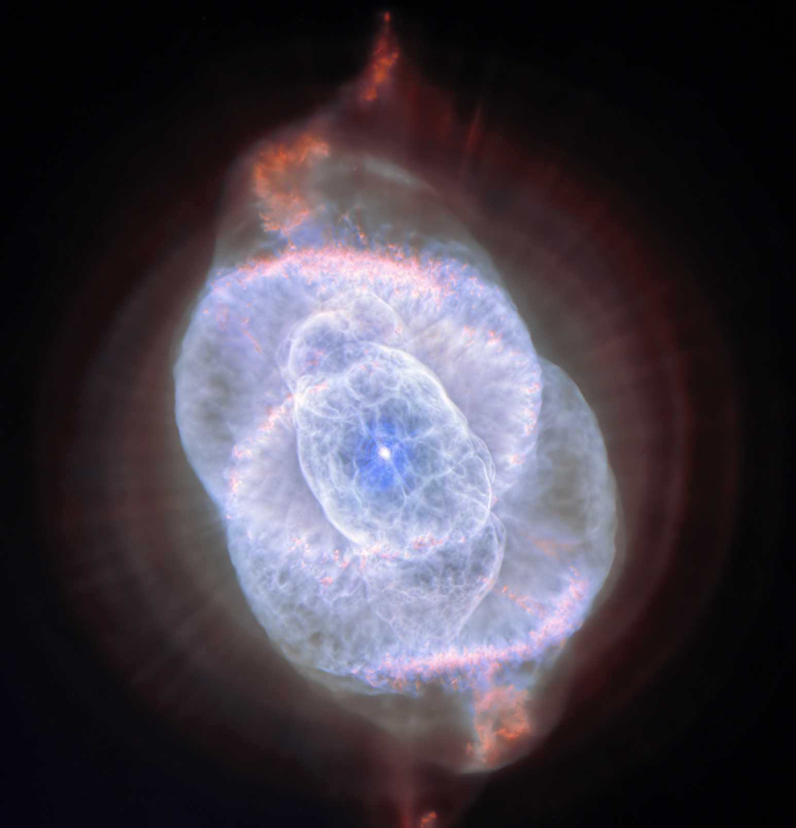Туманность «Кошачий глаз», открытая еще в 1864 году, на протяжении полутора столетий восхищает астрономов и астрофотографов. Совместная работа телескопов «Евклид» и «Хаббл» позволила увидеть ее в совершенно новом свете.