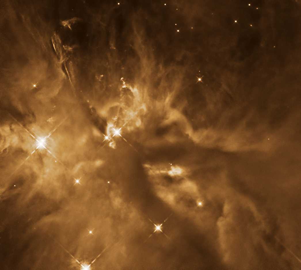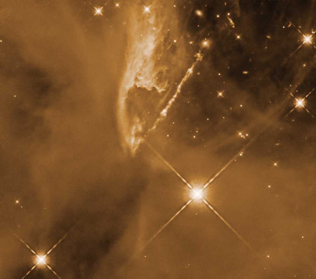 Третье изображение демонстрирует еще одну протозвезду и созданную ею масштабную полость в газопылевом облаке — наглядное свидетельство того, как энергичные ветры молодых звезд формируют окружающее пространство. В правом верхнем углу кадра просматриваются фоновые звезды.